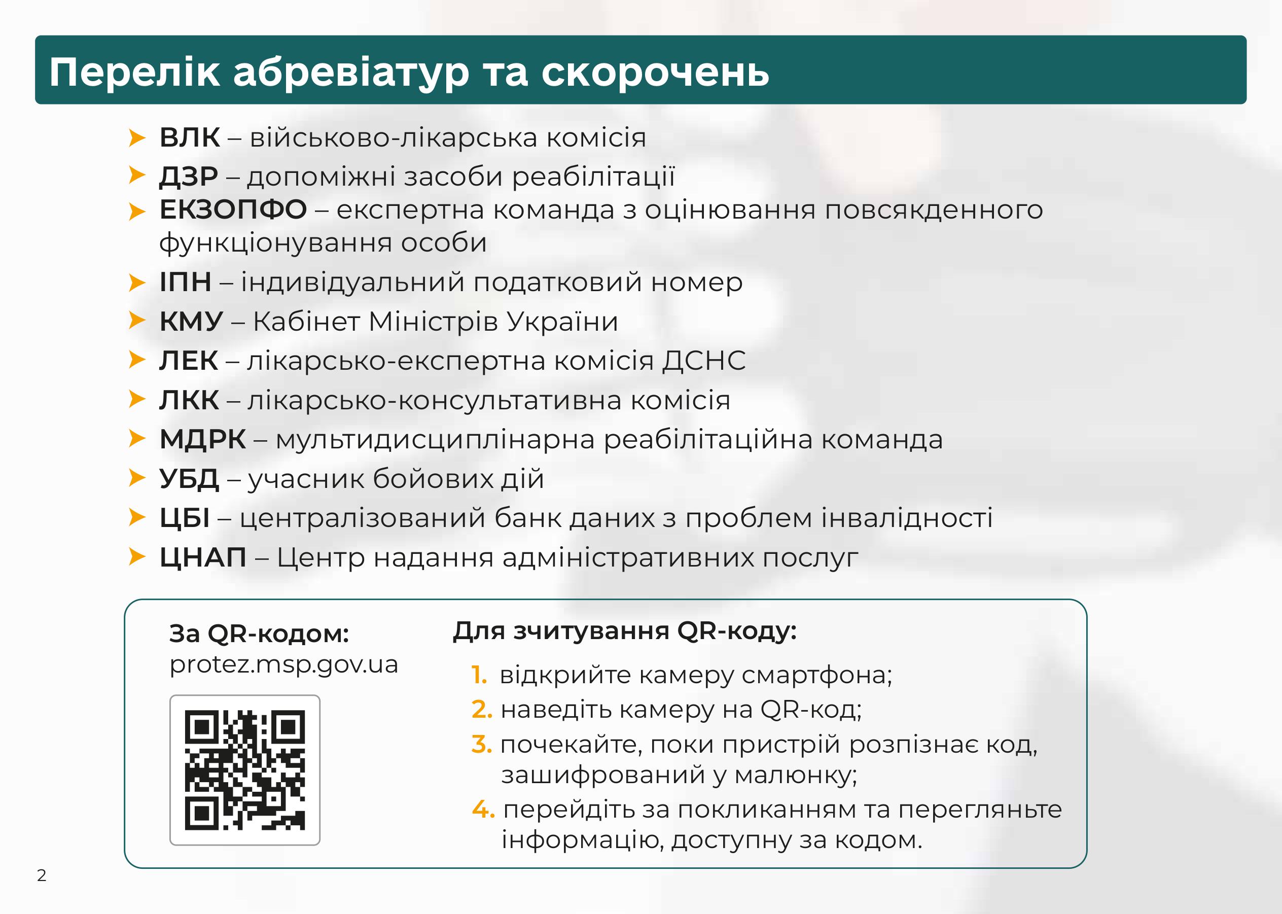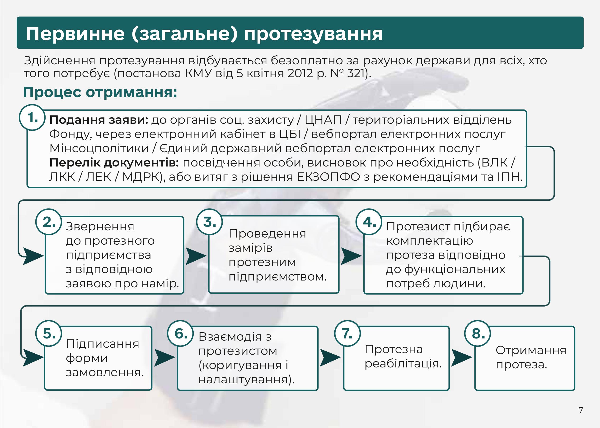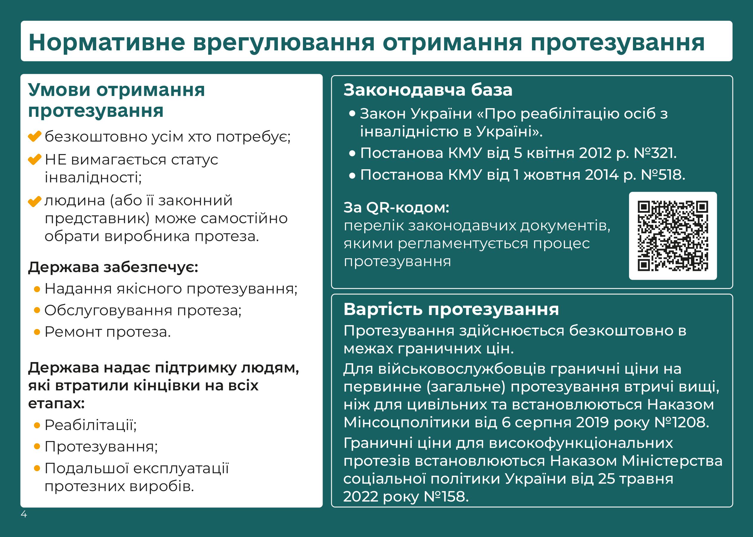 Протезування в Україні безоплатне для всіх, хто його потребує. Держава оплачує надання якісних протезів, а також їх обслуговування та ремонт. Для отримання якісного протеза не потрібно чекати отримання статусу інвалідності. Особа (або її законний представник) може самостійно обирати виробника протеза. Право на отримання безкоштовних допоміжних засобів реабілітації має будь-який громадянин України, незалежно від статусу та віку, за наявності медичних показань.